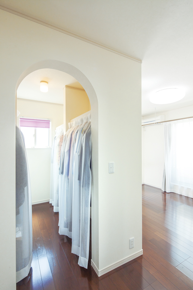 アーチ型の出入口がおしゃれな寝室のウォークインクローゼット イエタテ