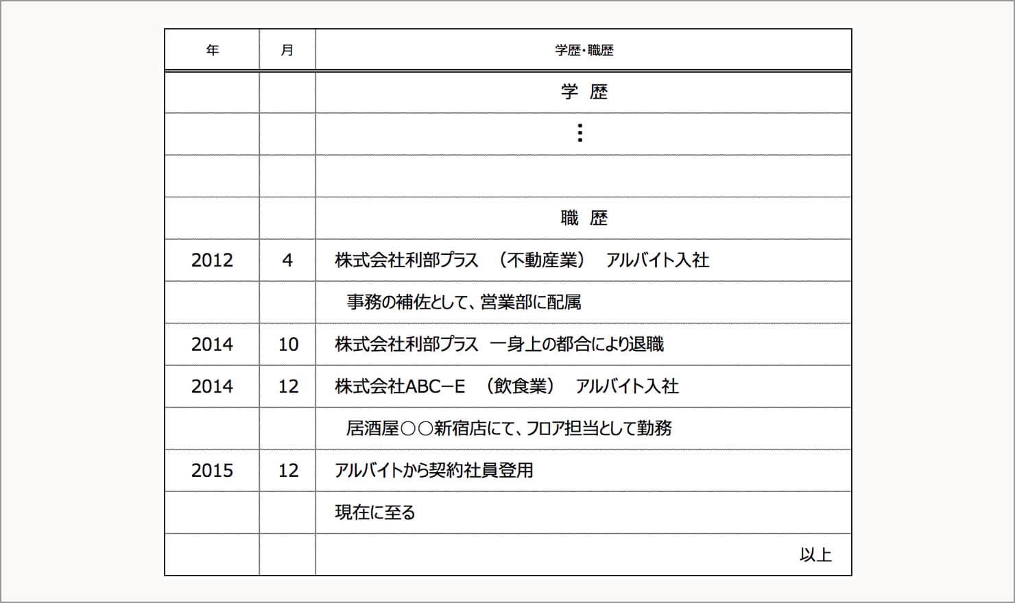 履歴書の職務経歴欄に 企業名を 株式会社 と正式名称で記入し 横に アルバイト と雇用形態を記入 してください. 履歴書の職歴欄にアルバイト経験を記入する時の書き方 ケース別 アルバイト経験の書き方 基本の書き方.