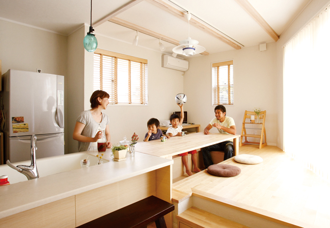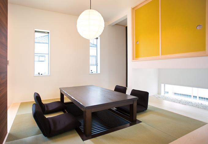 小上がりの畳スペースはダイニング 掘りごたつで 家族団らんの時間をゆったり過ごせる 地窓を切って明るさも確保した イエタテ